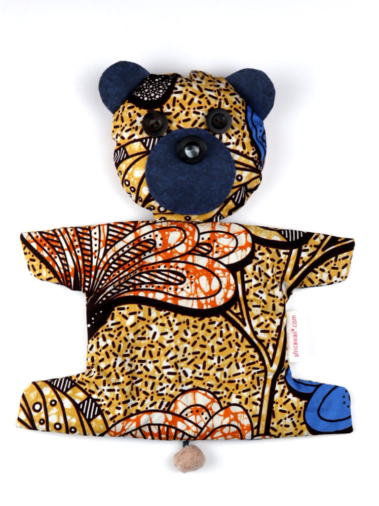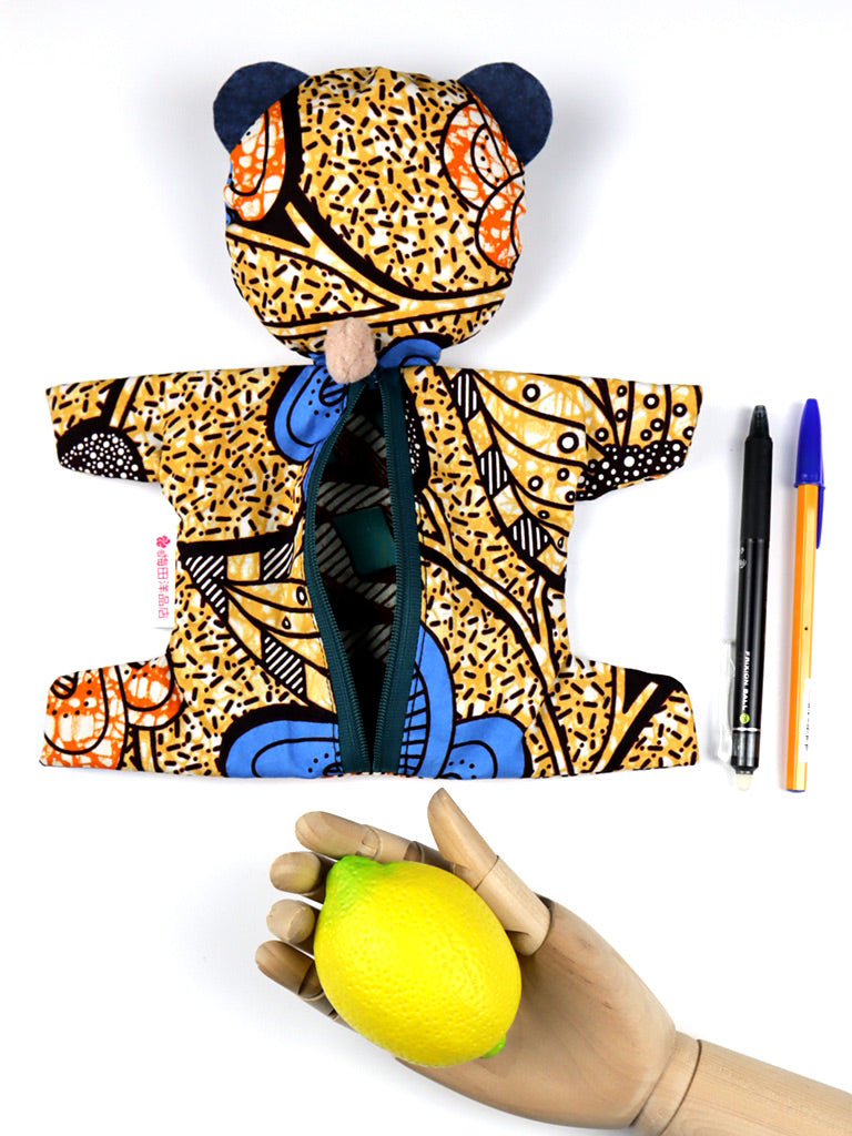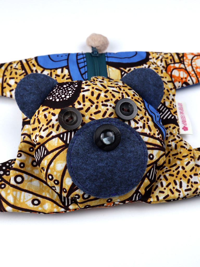 アフリカンプリントのくまポーチ・オーカー×ブルー