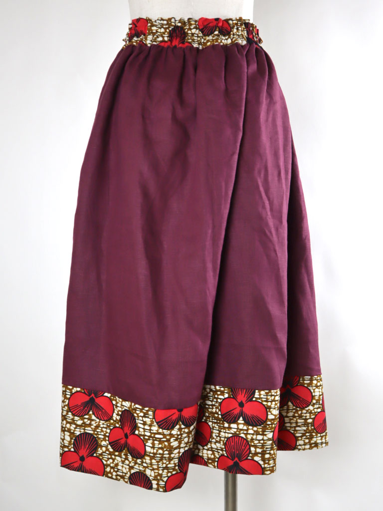 リネンのポケット付きギャザー切り替えスカート・レッドフラワーズ(リネン色ボルドー)