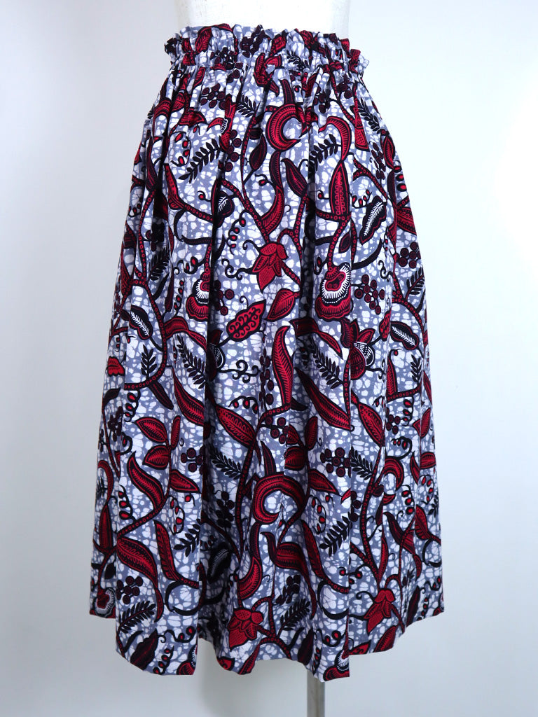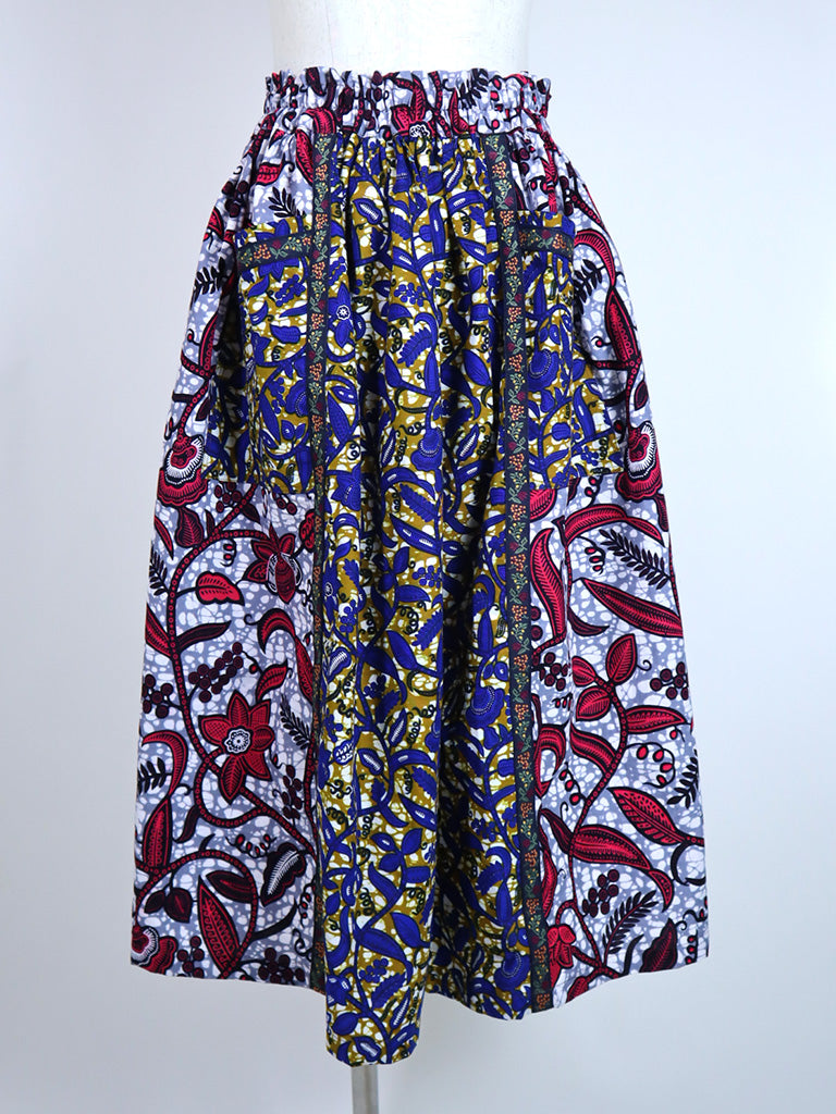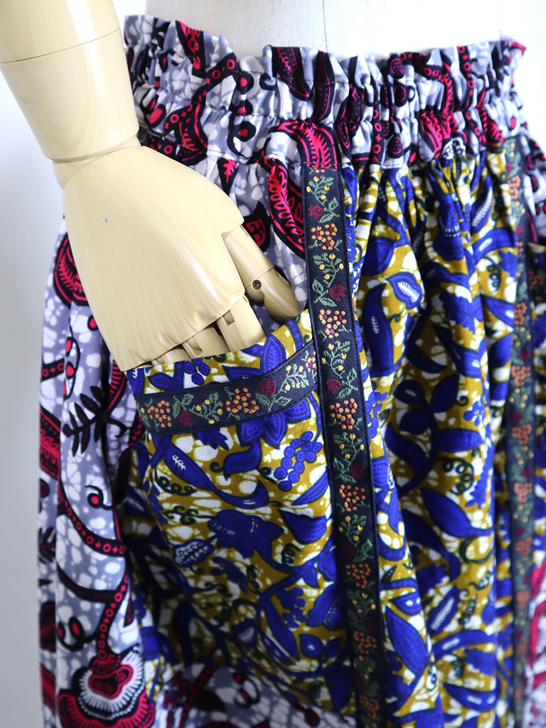 ポケット付きフォークロア・ロングスカート・ボタニカルブルー&レッド