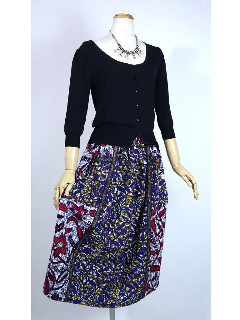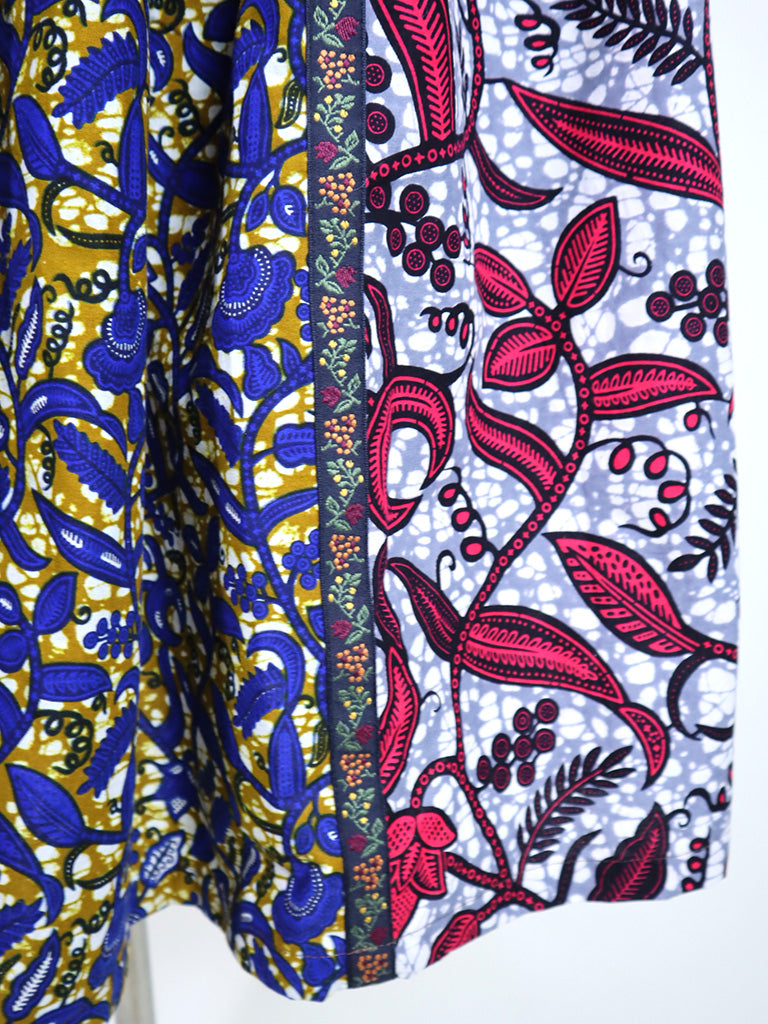 2種類のアフリカンプリントを使用し、中心布の切り替え部分とパッチポケットの口に刺繍テープをあしらいました。