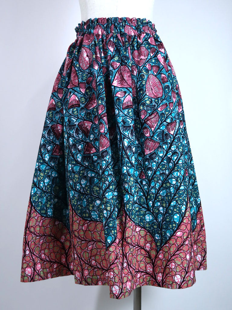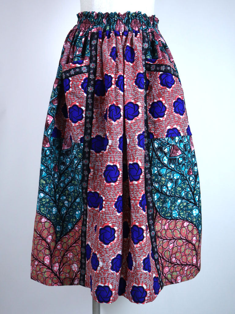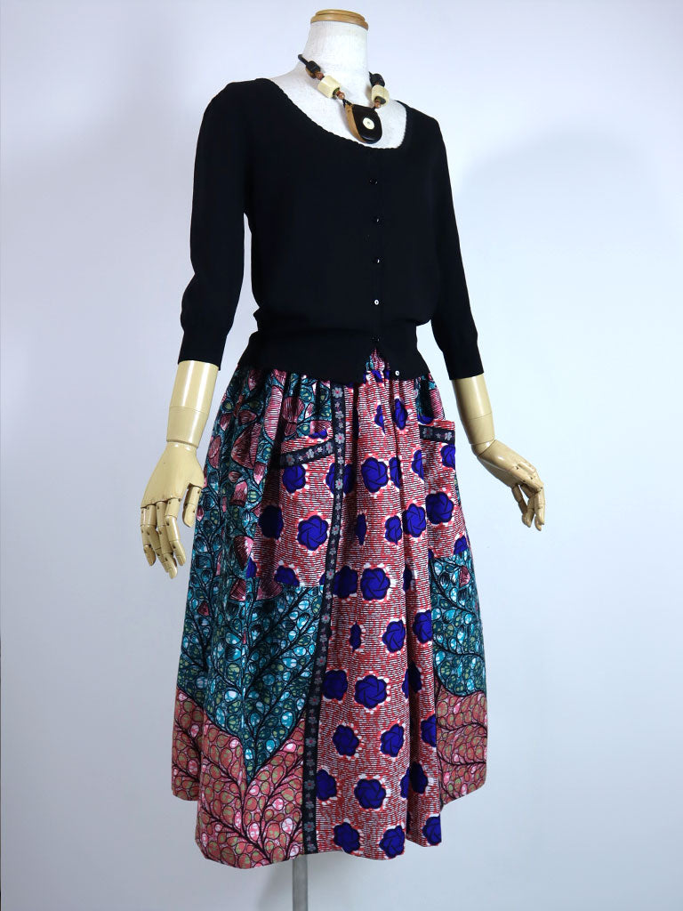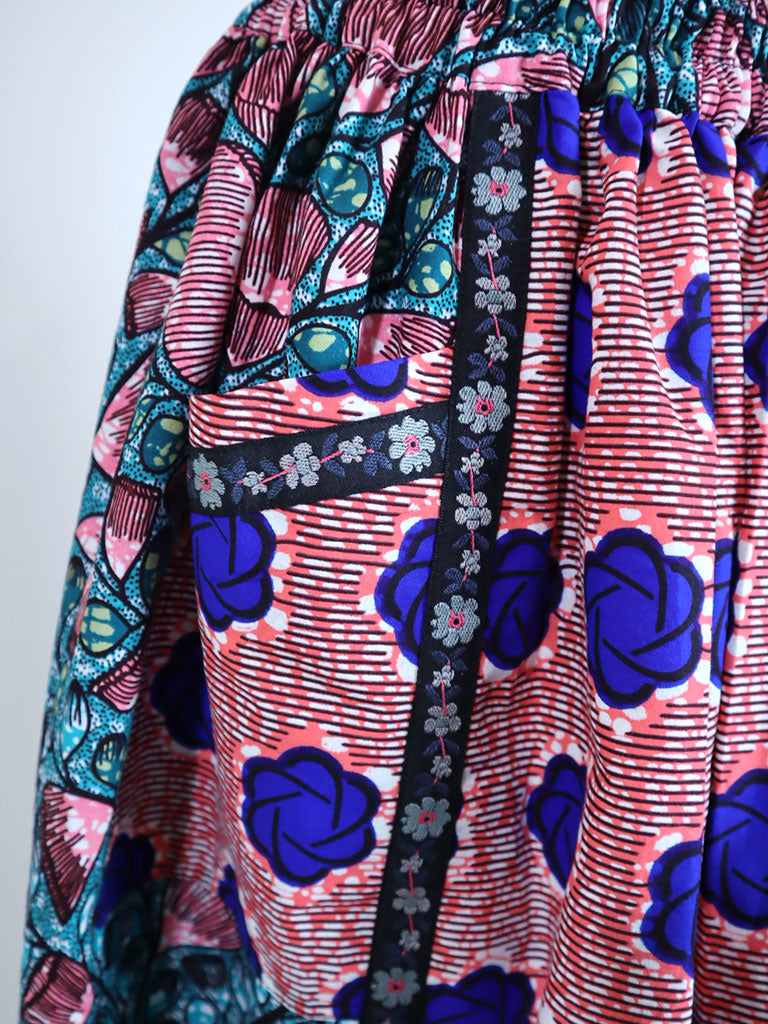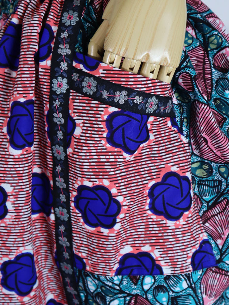 2種類のアフリカンプリントを使用し、中心布の切り替え部分とパッチポケットの口に刺繍テープをあしらいました。