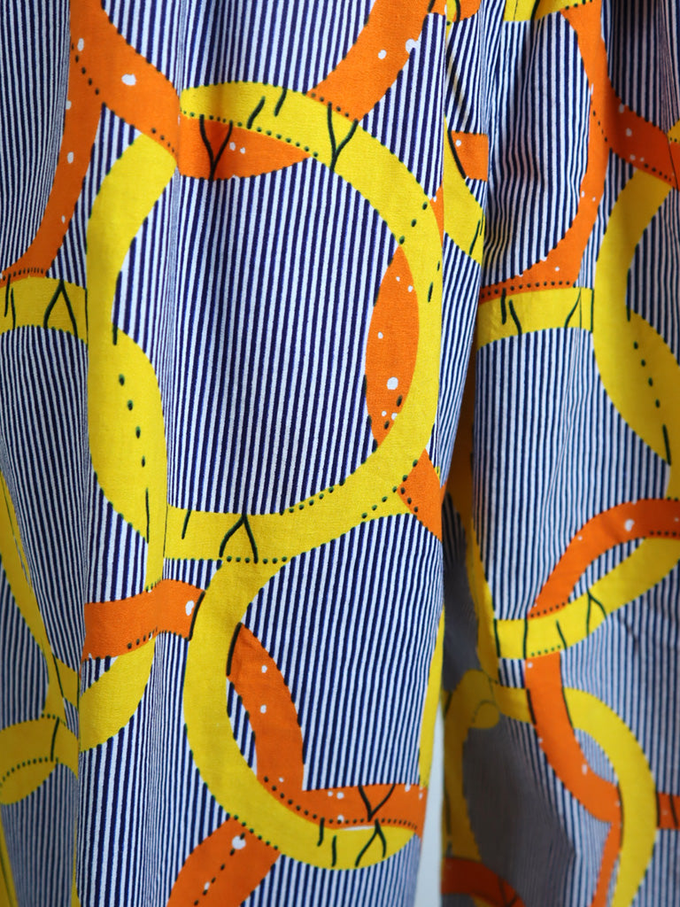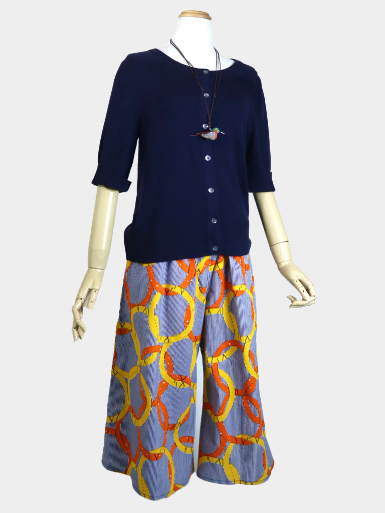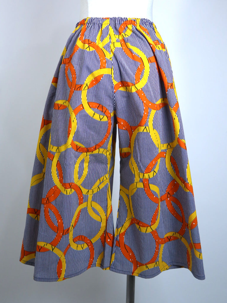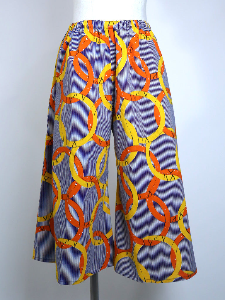 ゆったりとしていて動きやすい、アフリカンプリントでつくった「ガウチョパンツ」です。