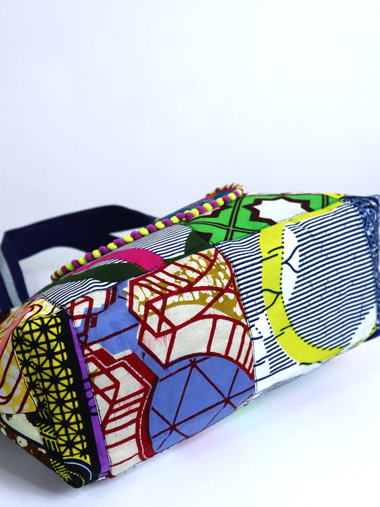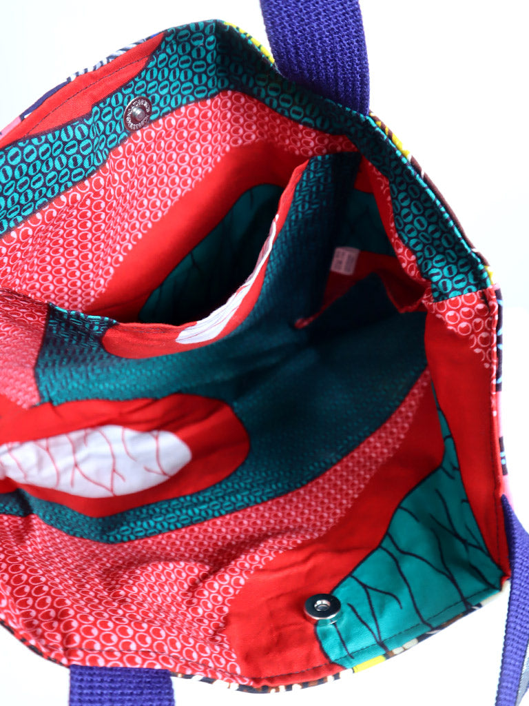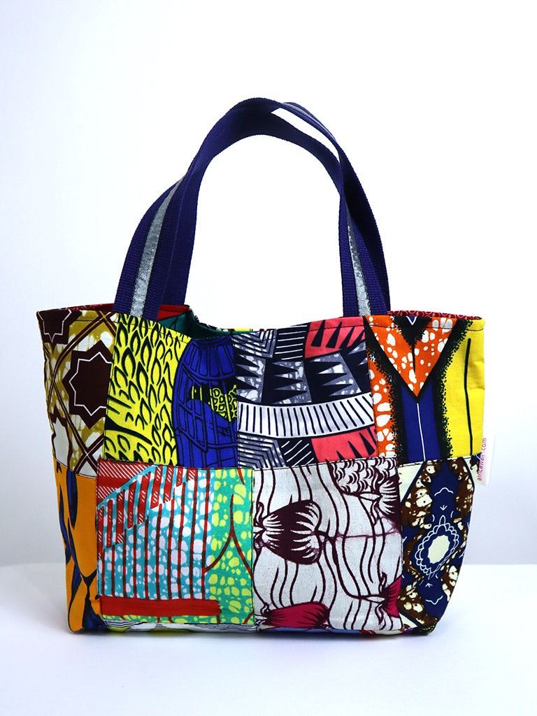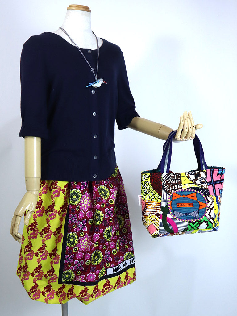 西アフリカのプリント布を使った、持ち運びが楽しくなる「アップサイクル」のバッグです。