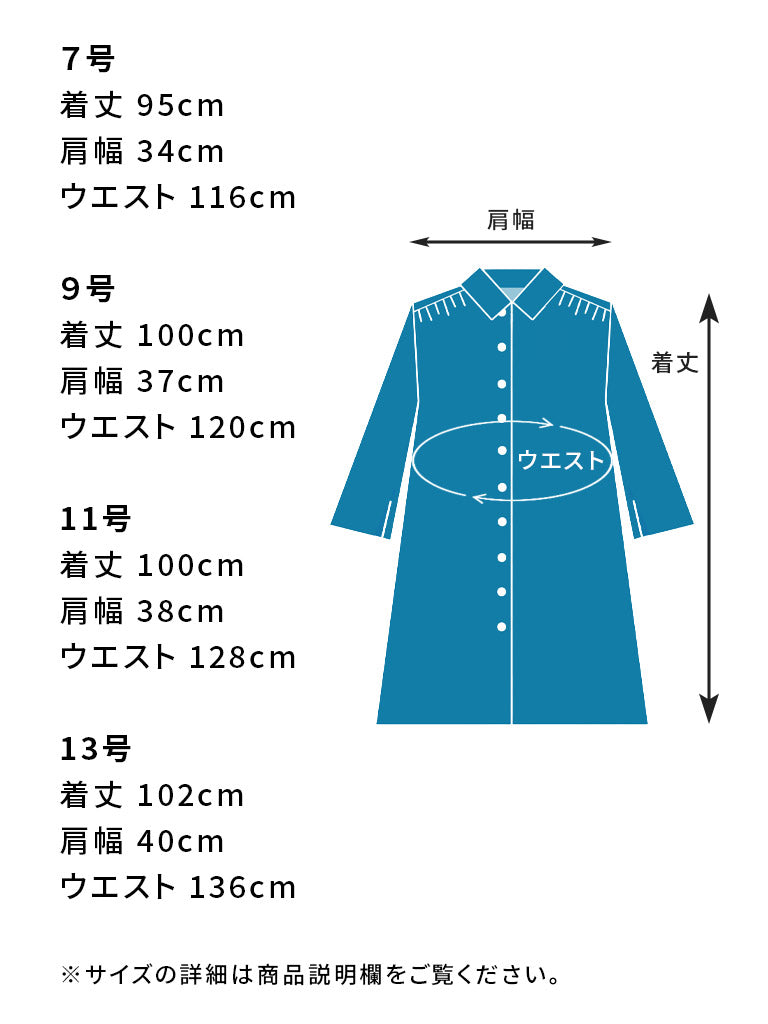 【13号】 肩幅 40cm / バスト 126cm / ウエスト 136cm / ヒップ 144cm / 袖ぐり 50cm / 袖丈 47cm / 袖口 34cm / スリット 7cm / 着丈 102cm / 紐 1.5×220cm