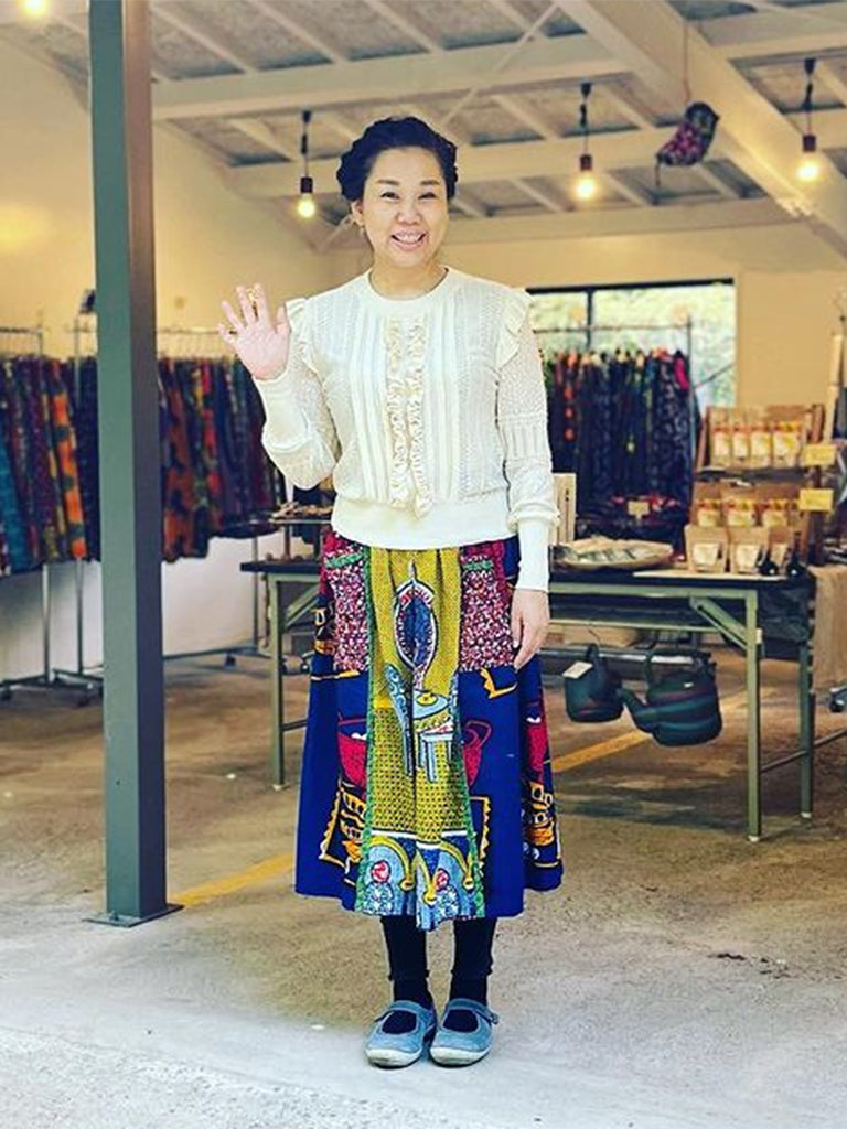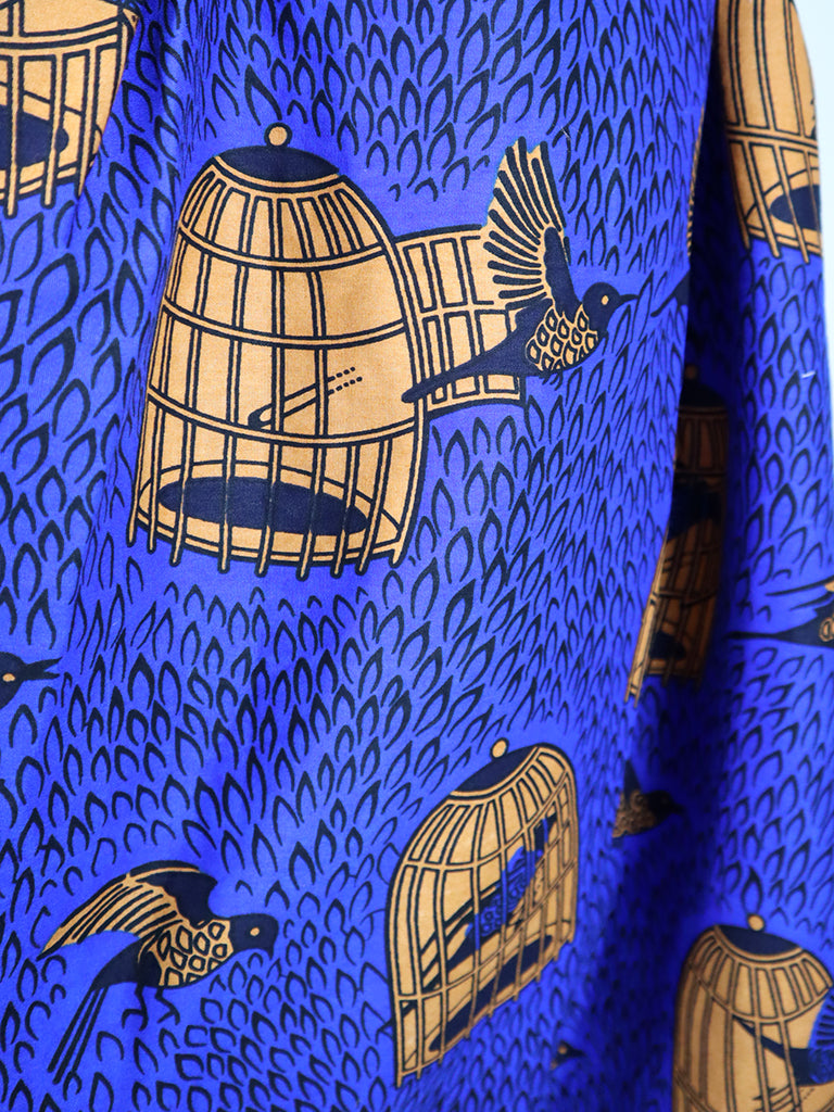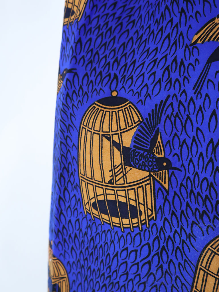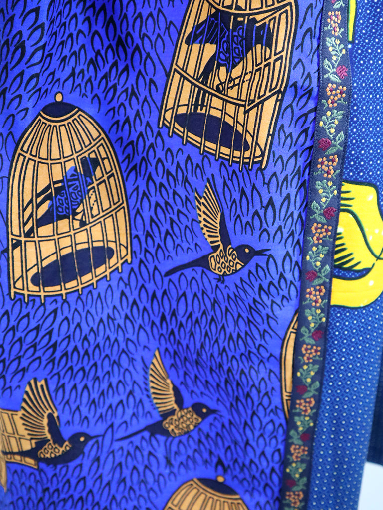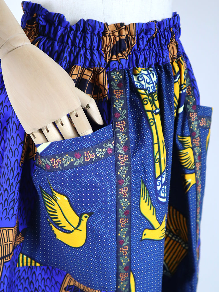 2種類のアフリカンプリントを使用し、中心布の切り替え部分とパッチポケットの口に刺繍テープをあしらいました。