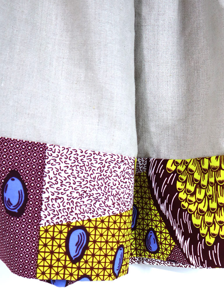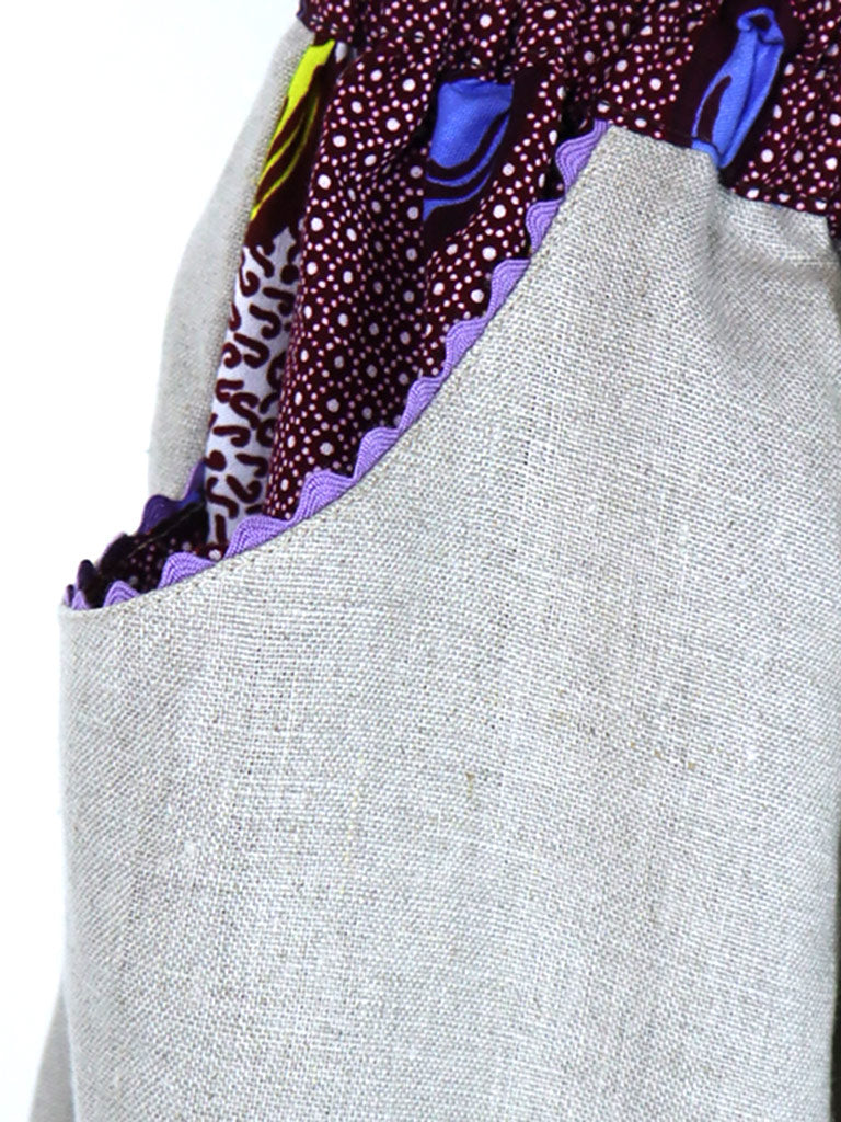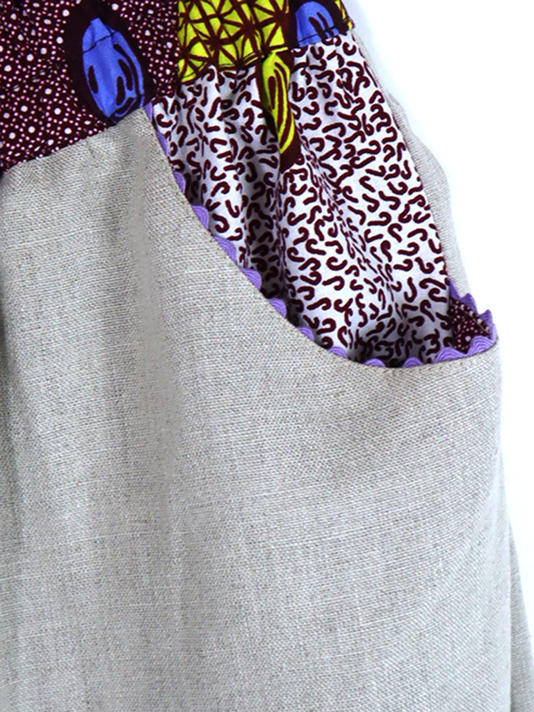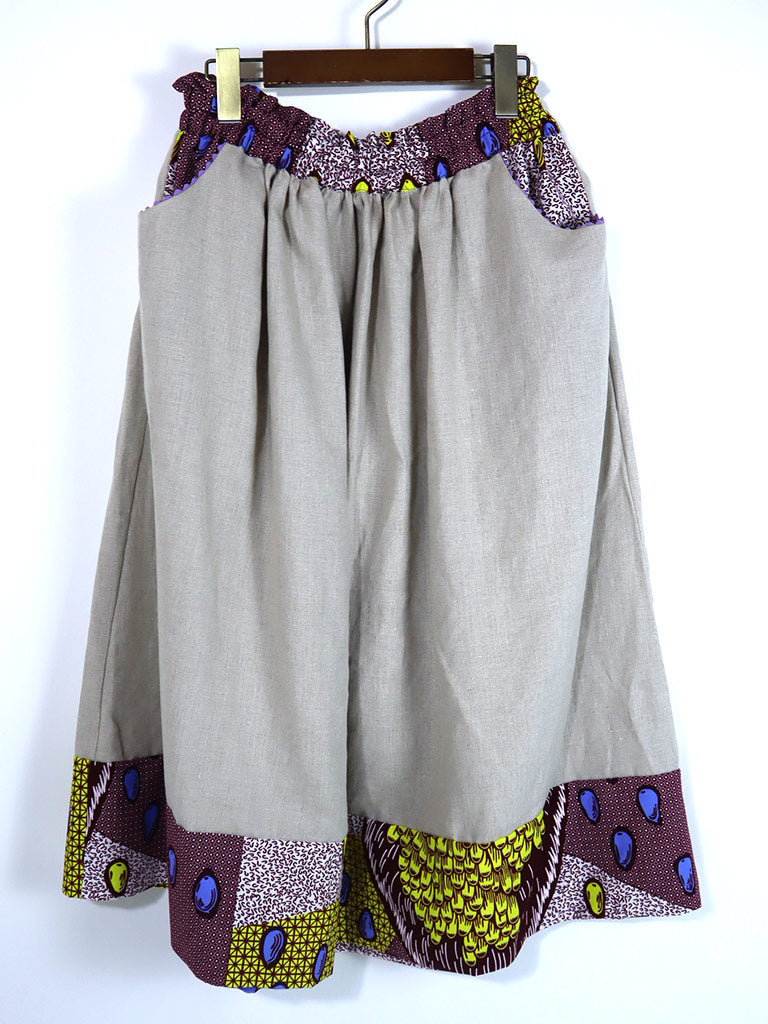 ウエストベルト、ポケット、裾の切り替えから下はアフリカンプリント。