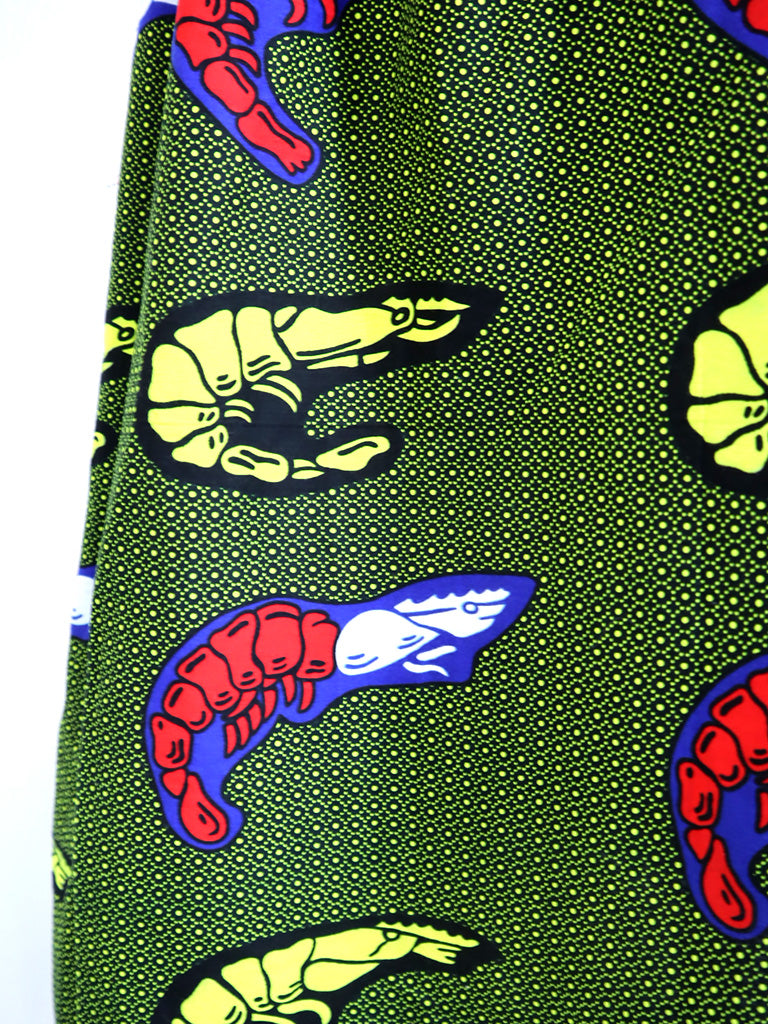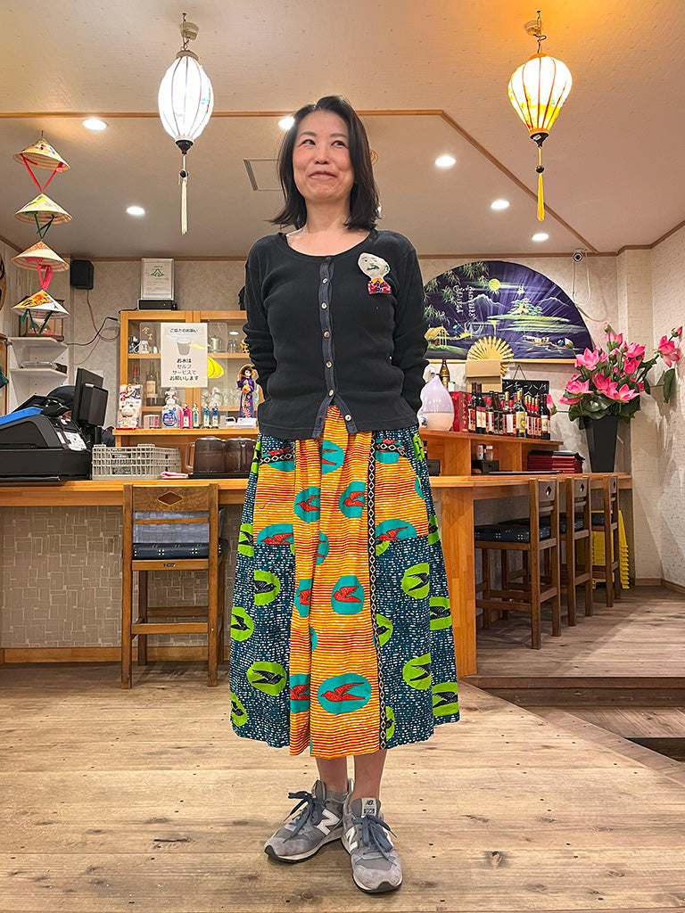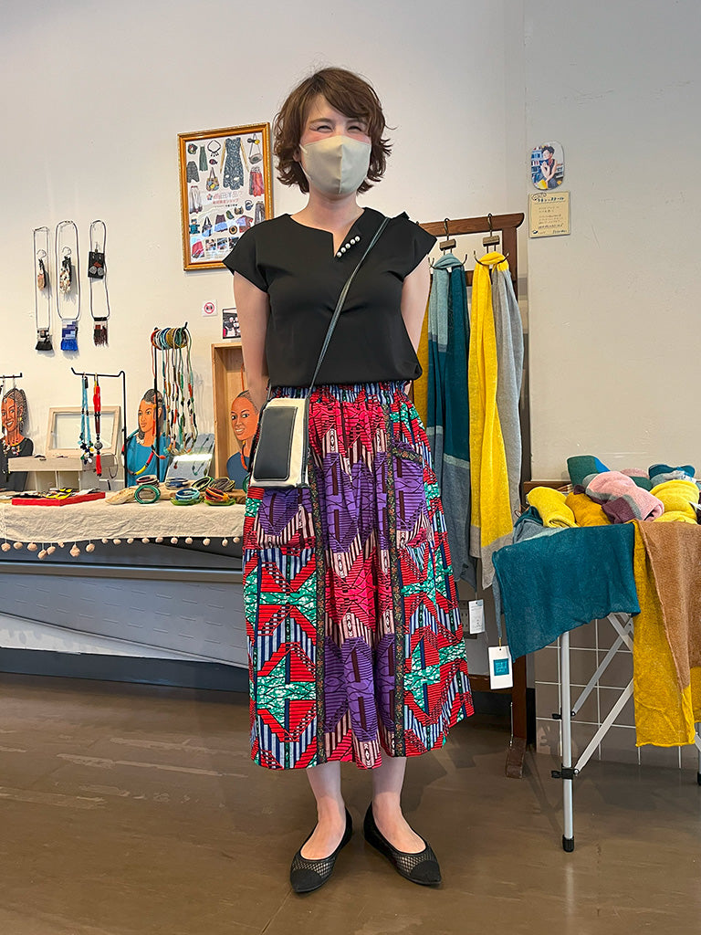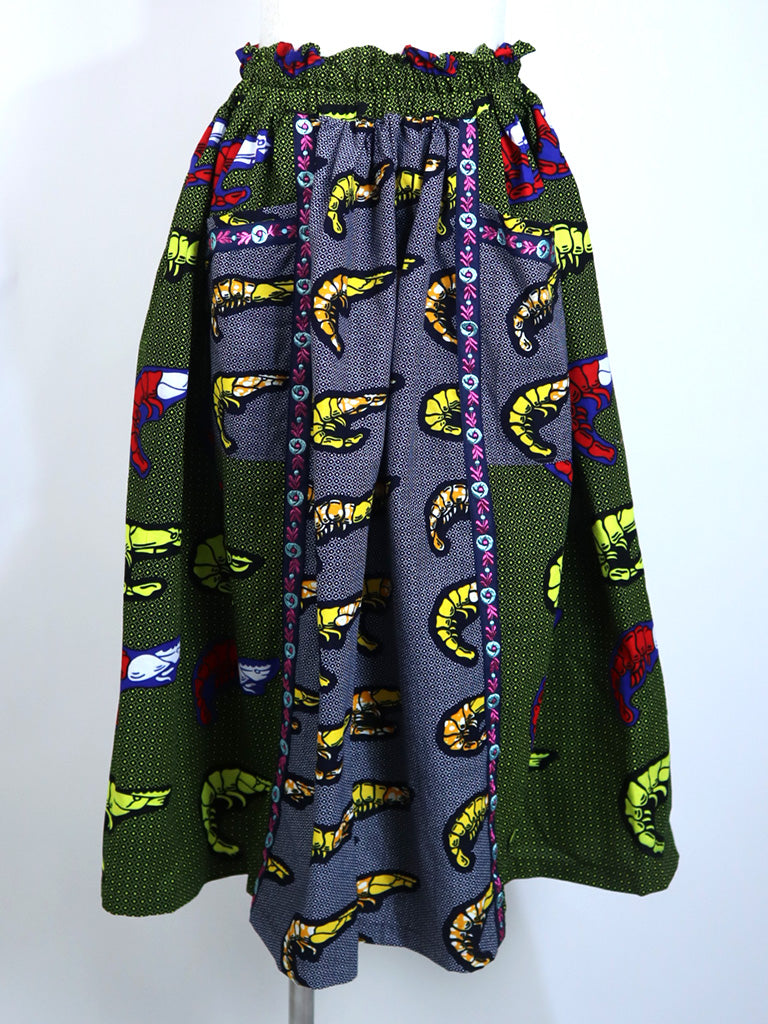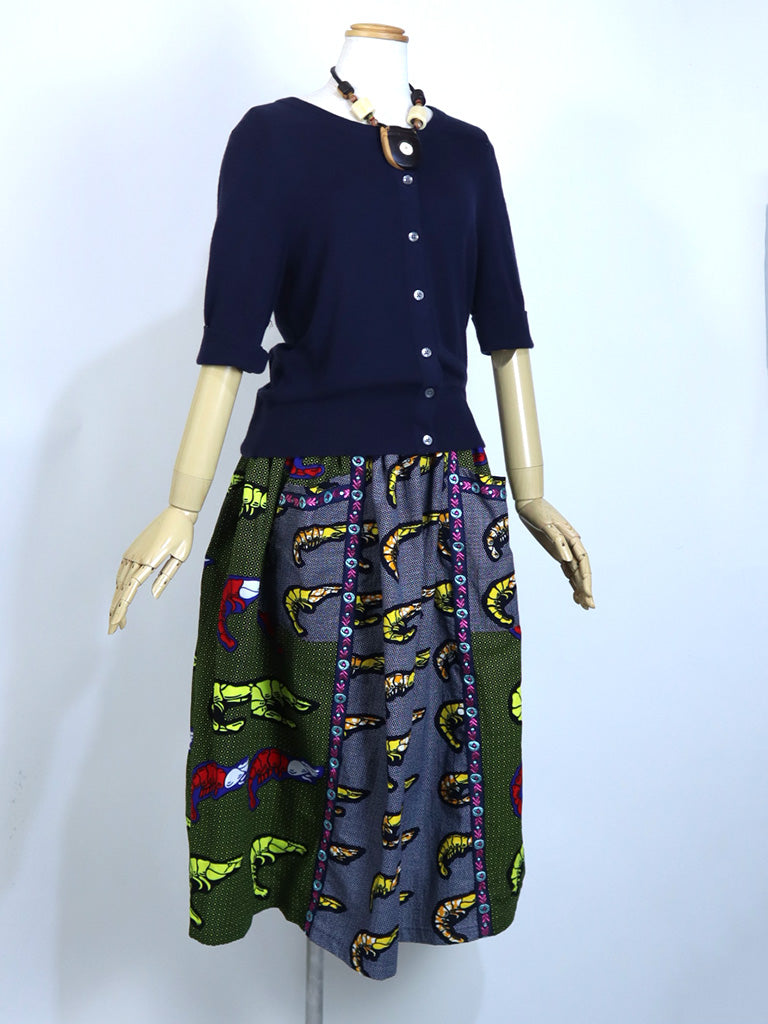 2種類のアフリカンプリントを使用し、中心布の切り替え部分とパッチポケットの口に刺繍テープをあしらいました。
