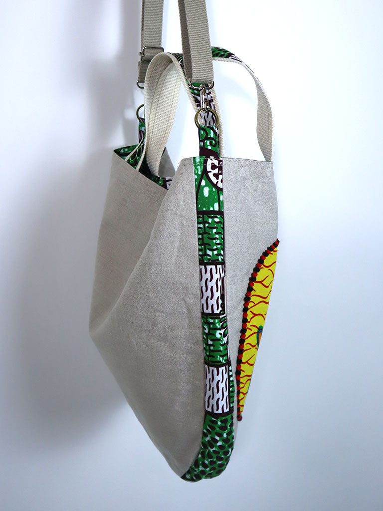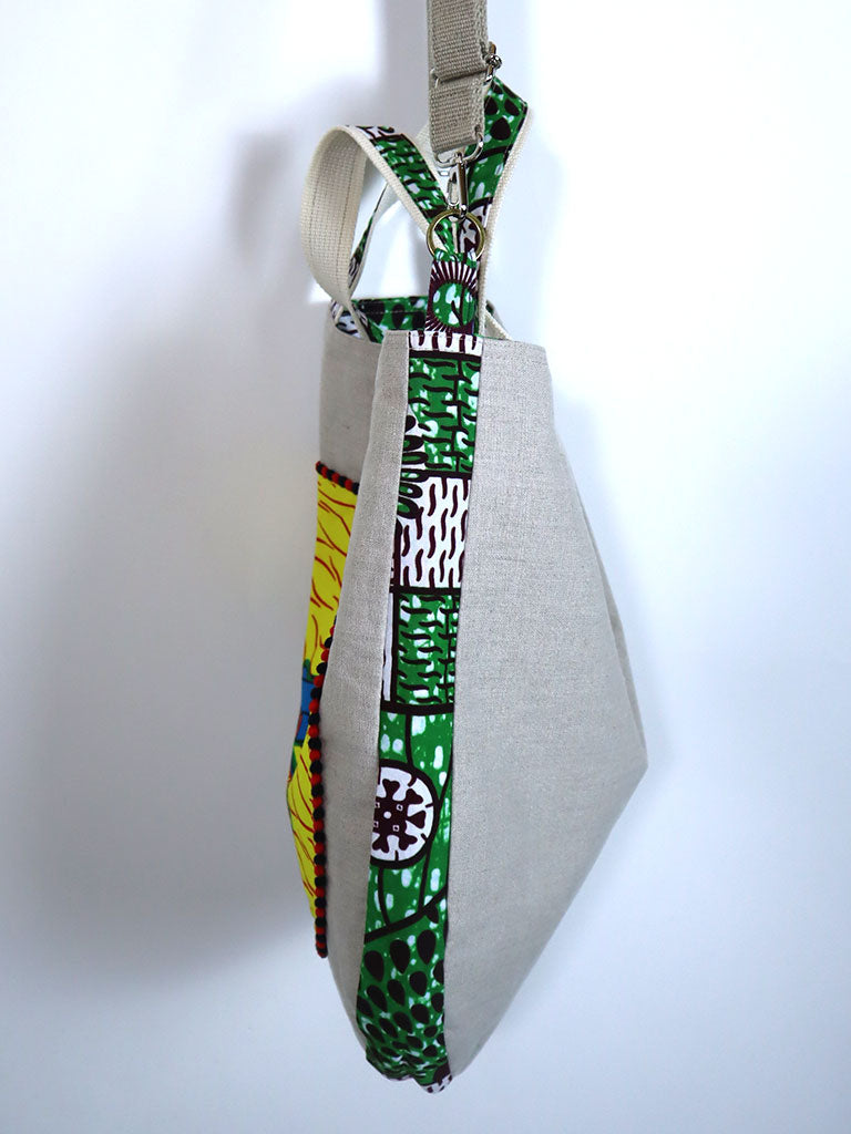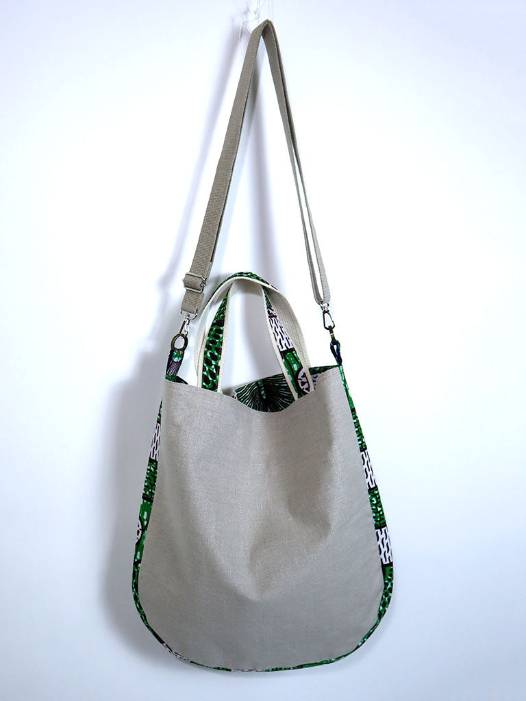 リネンを表地に、アフリカンプリントをサイドと裏地に使用したバッグです。手持ちはもちろん、ストラップで肩掛け・斜め掛けができる2way仕様です。