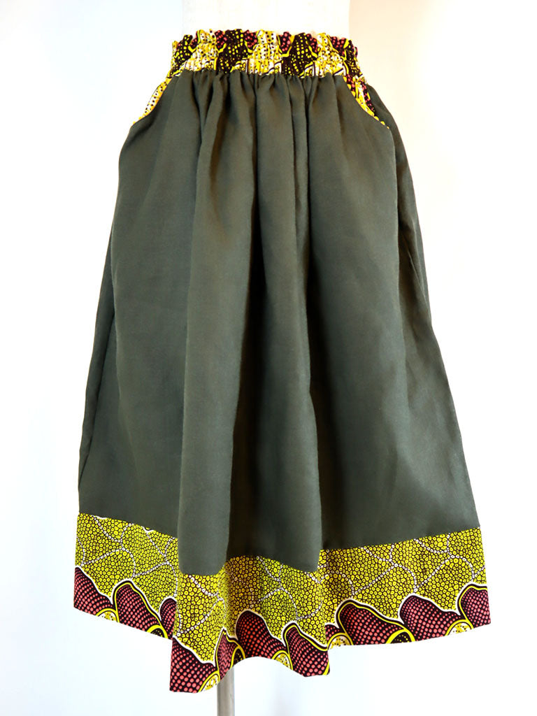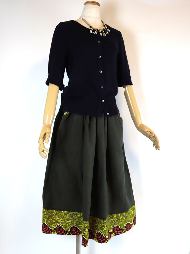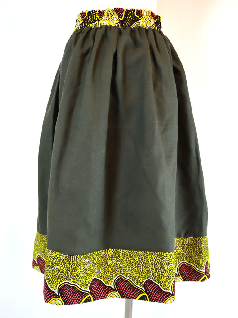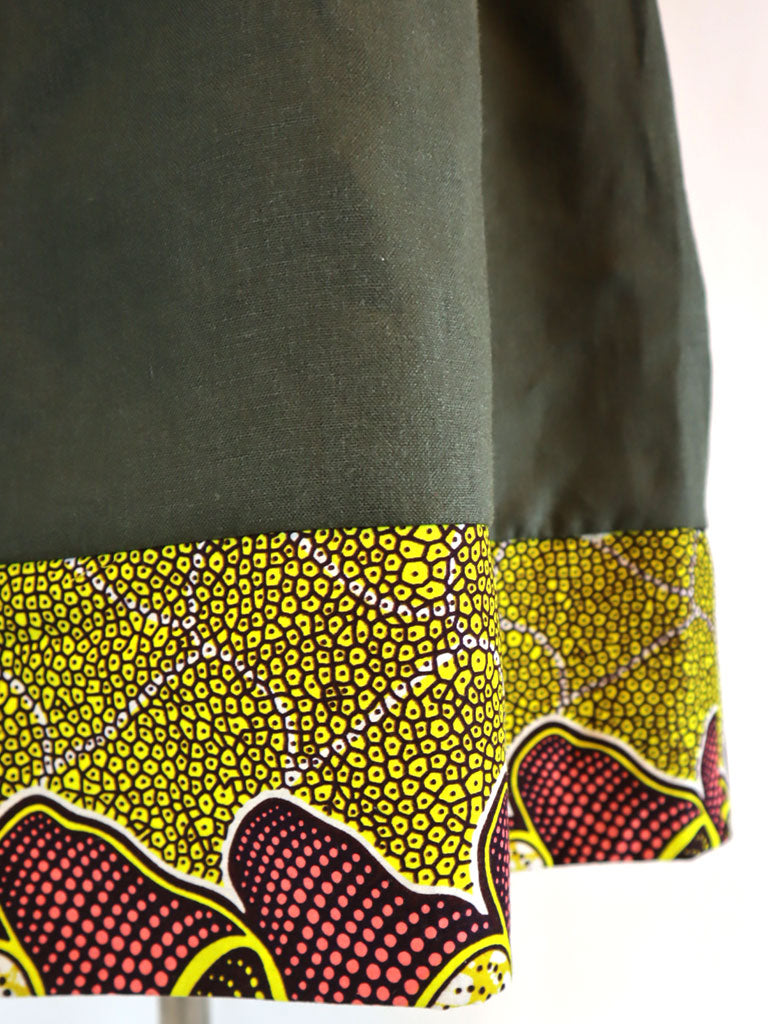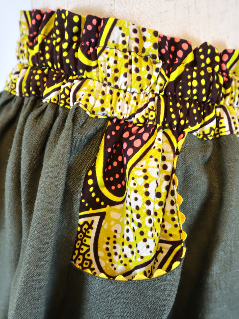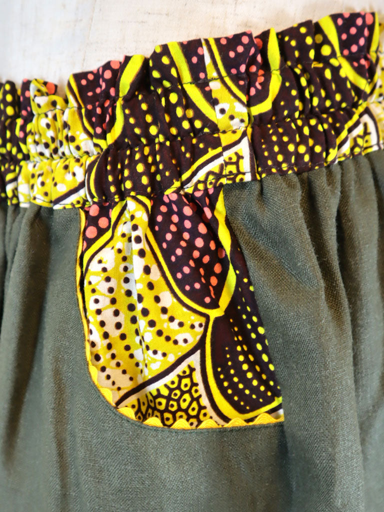 ウエストベルト、ポケット、裾の切り替えから下はアフリカンプリント。