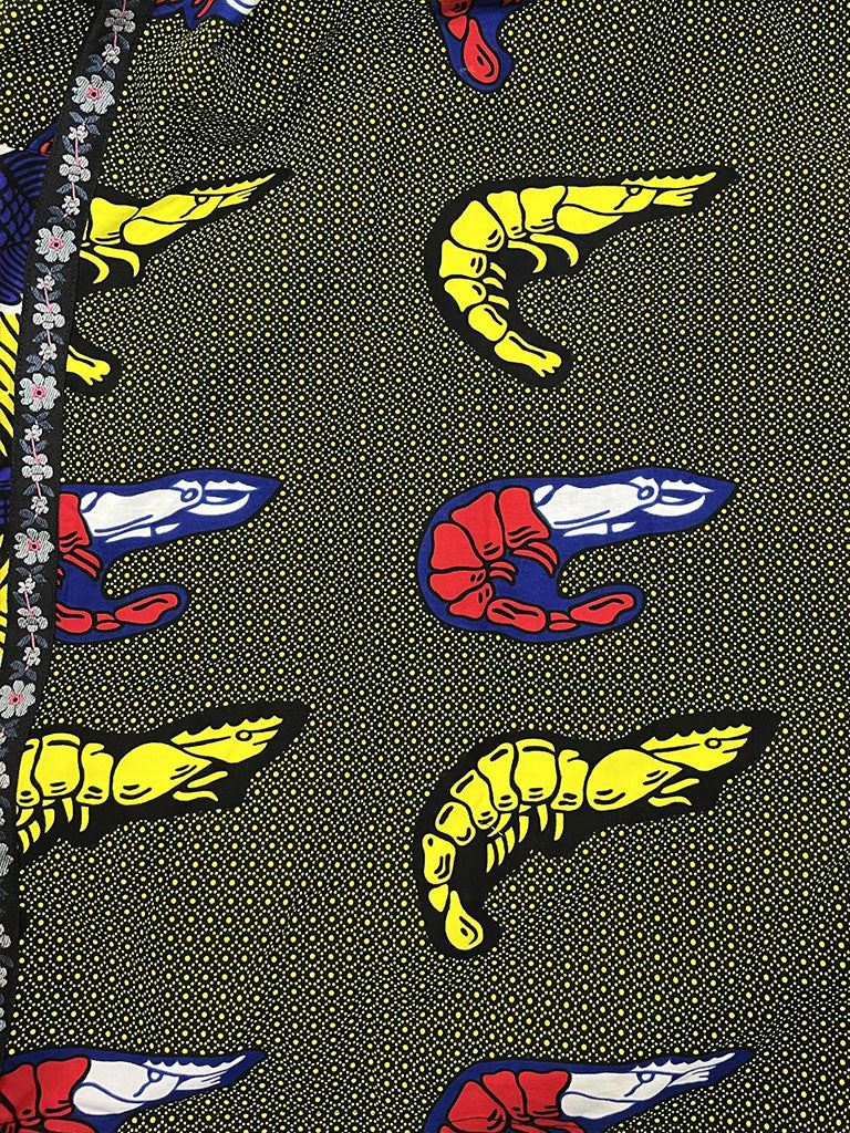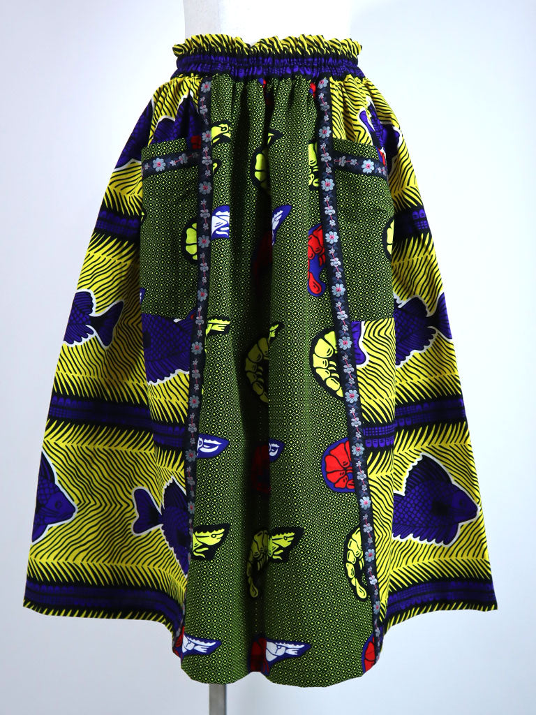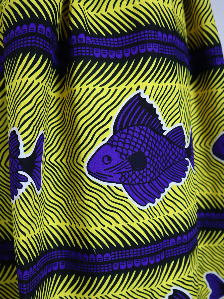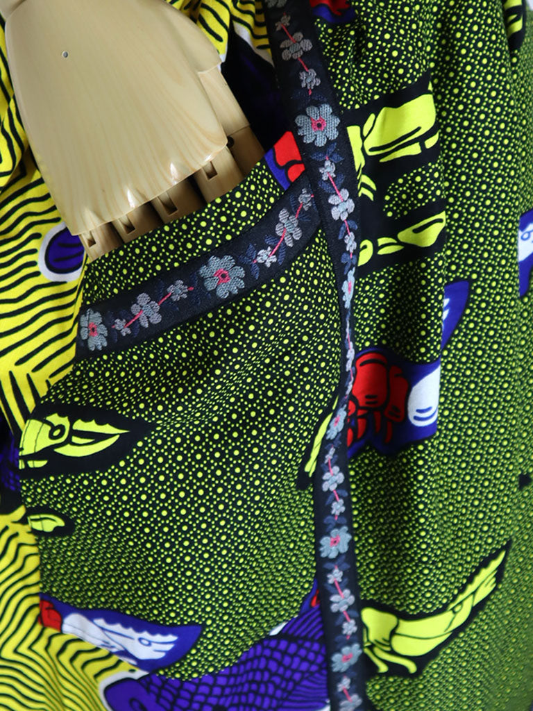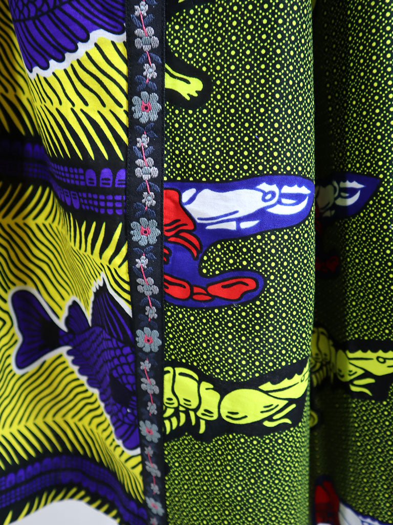 2種類のアフリカンプリントを使用し、中心布の切り替え部分とパッチポケットの口に刺繍テープをあしらいました。