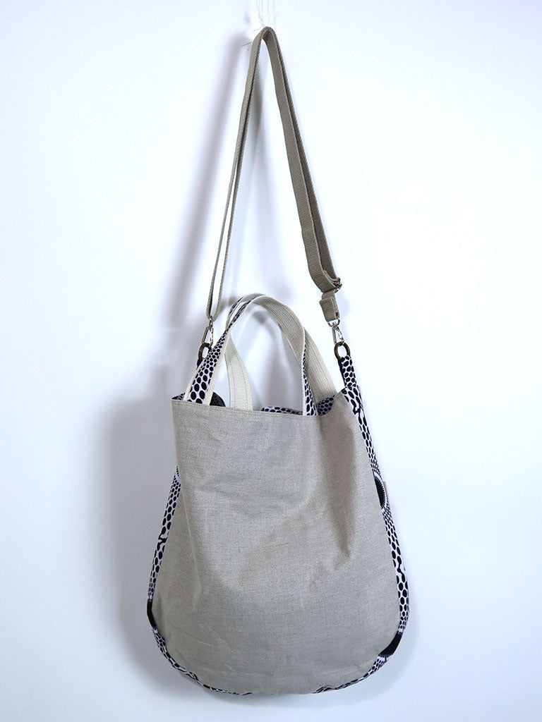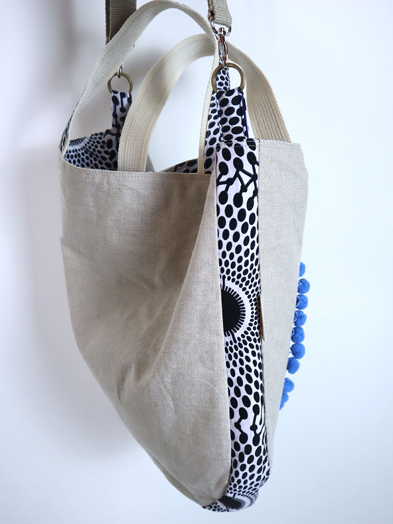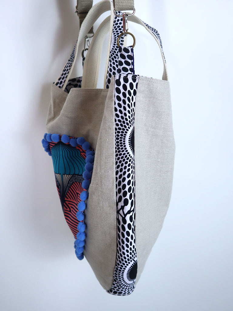リネンを表地に、アフリカンプリントをサイドと裏地に使用したバッグです。手持ちはもちろん、ストラップで肩掛け・斜め掛けができる2way仕様です。