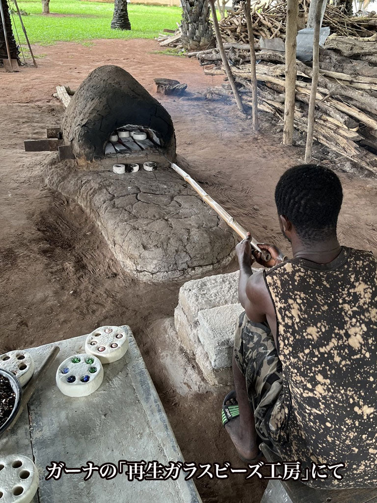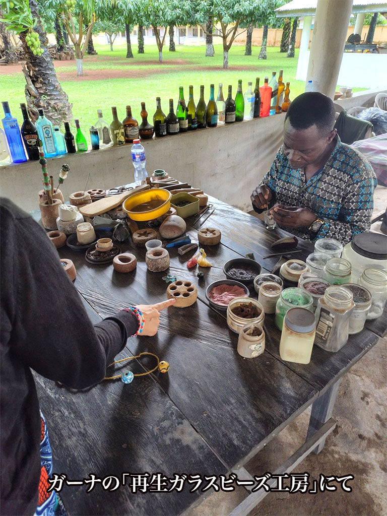 再生ガラスビーズは、窓ガラスや瓶などを砕いたものを再利用して焼き固めるサステナブルなビーズです。